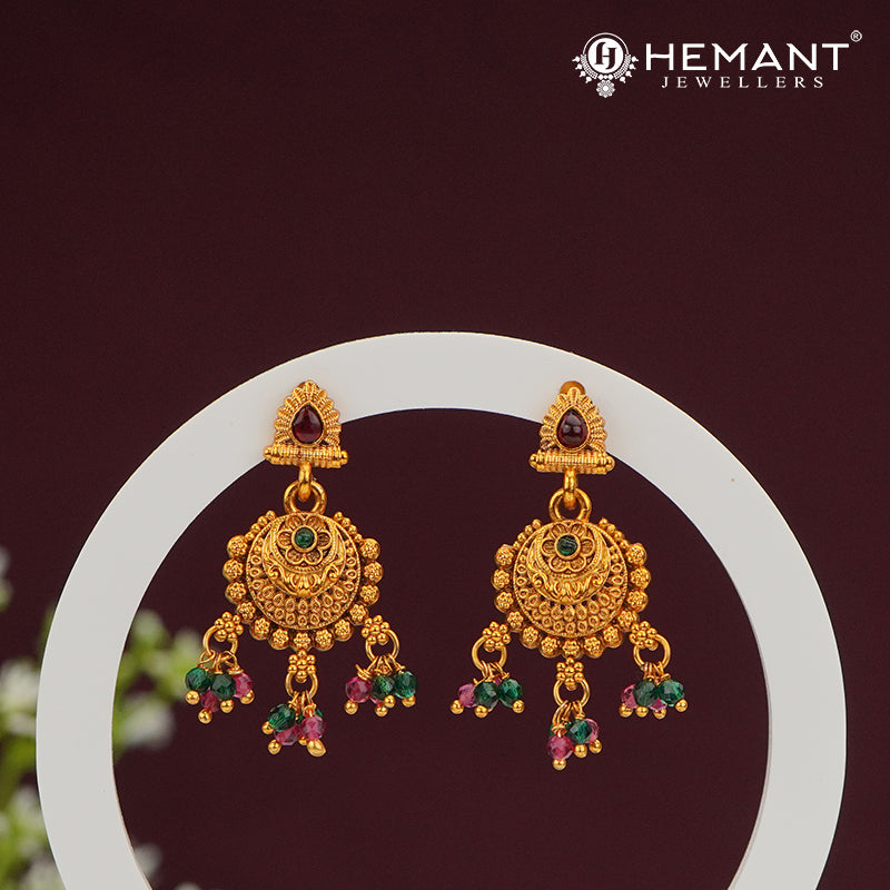 Step into timeless elegance with these antique-style circular temple earrings inspired by traditional South Indian jewelry. The top features a teardrop maroon stone setting with ornate granulation work that continues into a crescent-style circular motif, richly detailed with embossed textures and a central green gemstone.