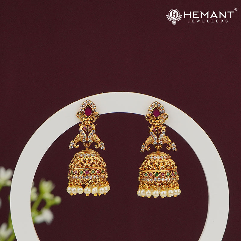 Unit price perMake a statement with these royal peacock-style jhumka earrings from Hemant Jewellers. These elegant earrings feature a majestic twin-peacock motif. The beautifully carved dome is accented with a band of green and pink stones, while classic pearl danglers complete the traditional charm. Ideal for weddings, festivals, or grand celebrations, these earrings bring together heritage design and modern elegance.