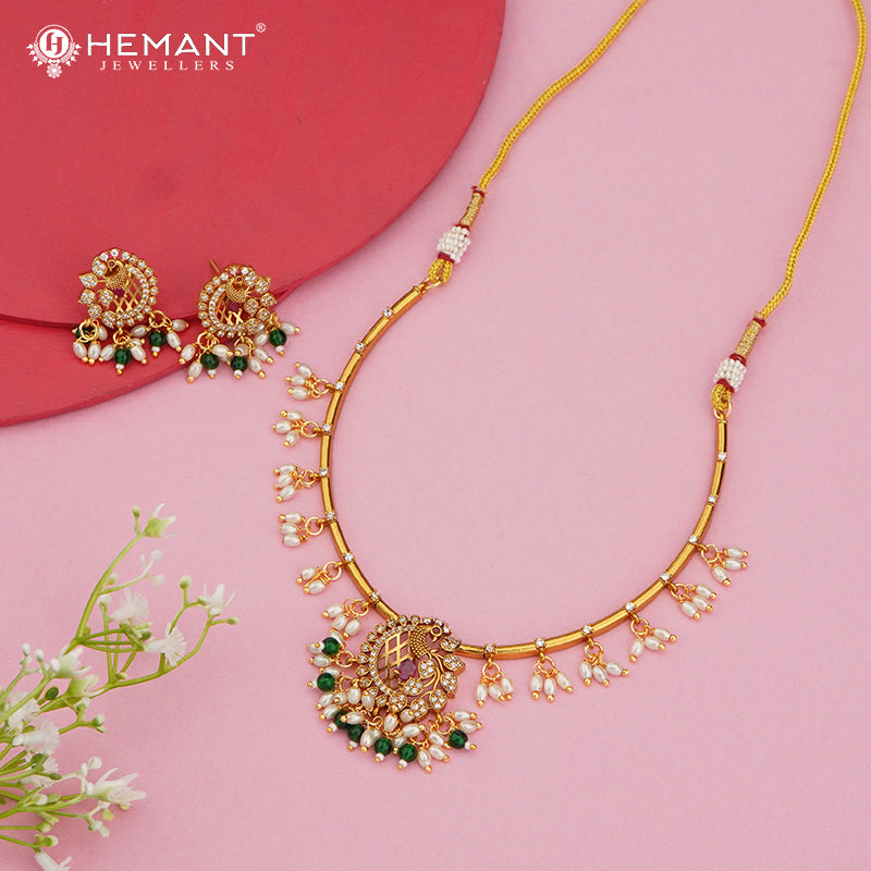 Antique Finished Peacock Pendant Necklace Set with Pearl & Green Bead Hangings – 4596-97