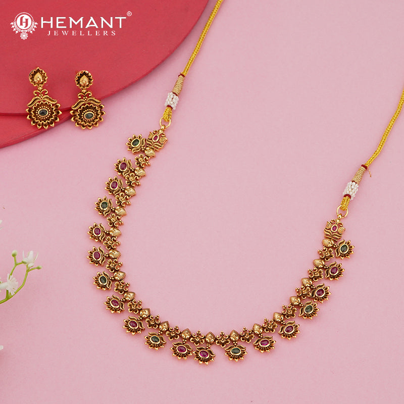Embodying traditional artistry with modern charm, this antique-finish necklace set showcases a striking lotus-floral pattern that gracefully encircles the neckline. The alternating ruby-red and green stone embellishments bring out the warmth of the golden base, making it ideal for festive and bridal occasions.