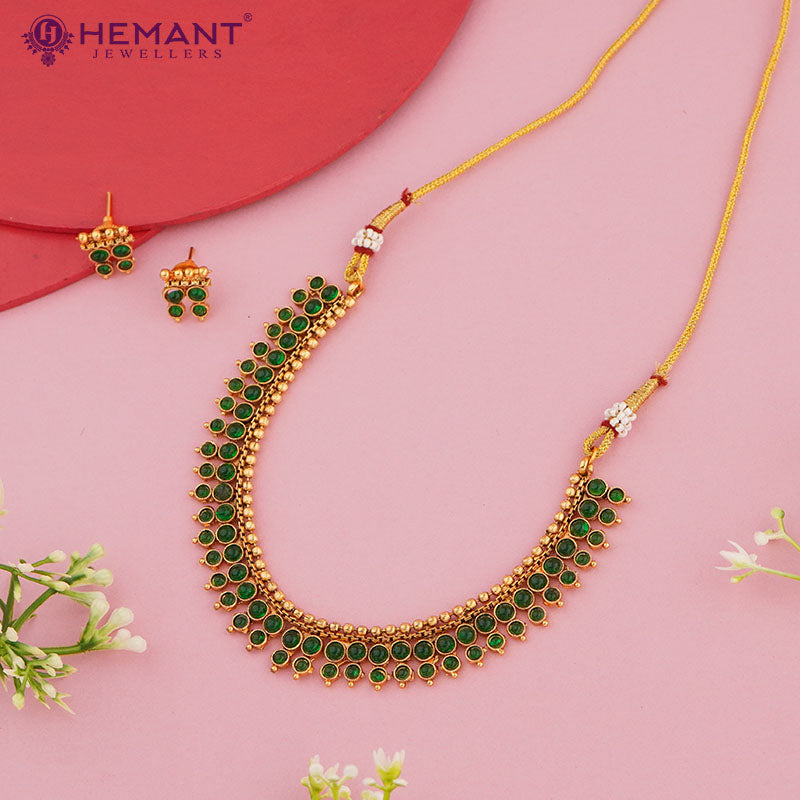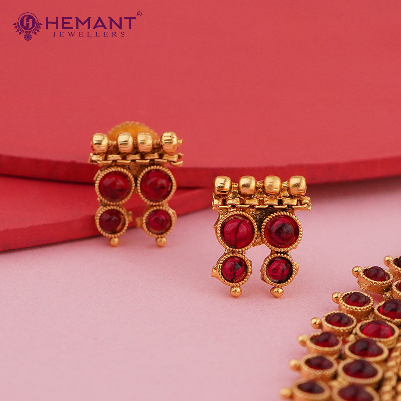This set, paired with complementing earrings, exudes the splendor of South Indian temple jewelry, making it ideal for weddings, festive events, and cultural festivities. Crafted from top-quality gold-plated material, it guarantees a lavish look and lasting strength, all while remaining lightweight for effortless wear.