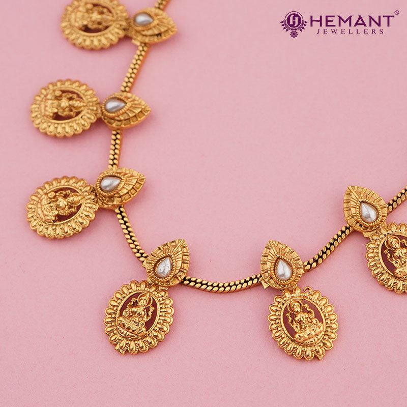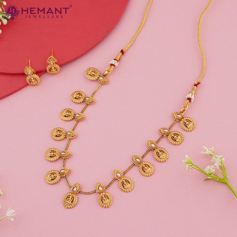 This set, paired with complementing earrings, exudes the splendor of South Indian temple jewelry, making it ideal for weddings, festive events, and cultural festivities. Crafted from top-quality gold-plated material, it guarantees a lavish look and lasting strength, all while remaining lightweight for effortless wear.
