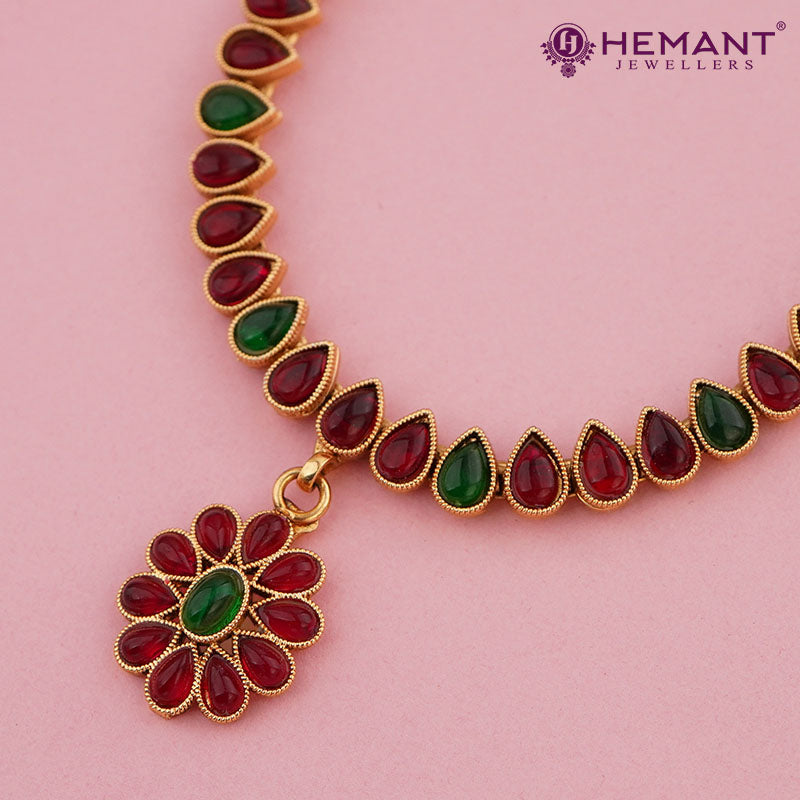 This set, paired with complementing earrings, exudes the splendor of South Indian temple jewelry, making it ideal for weddings, festive events, and cultural festivities. Crafted from top-quality gold-plated material, it guarantees a lavish look and lasting strength, all while remaining lightweight for effortless wear.