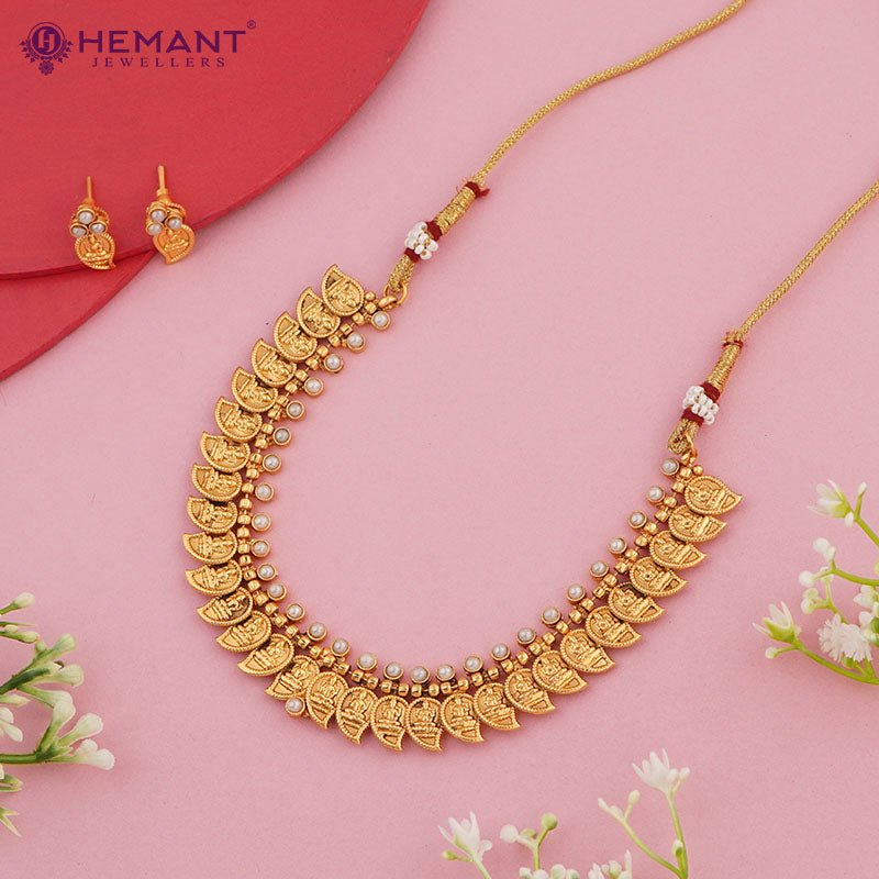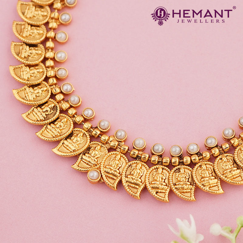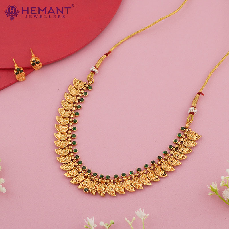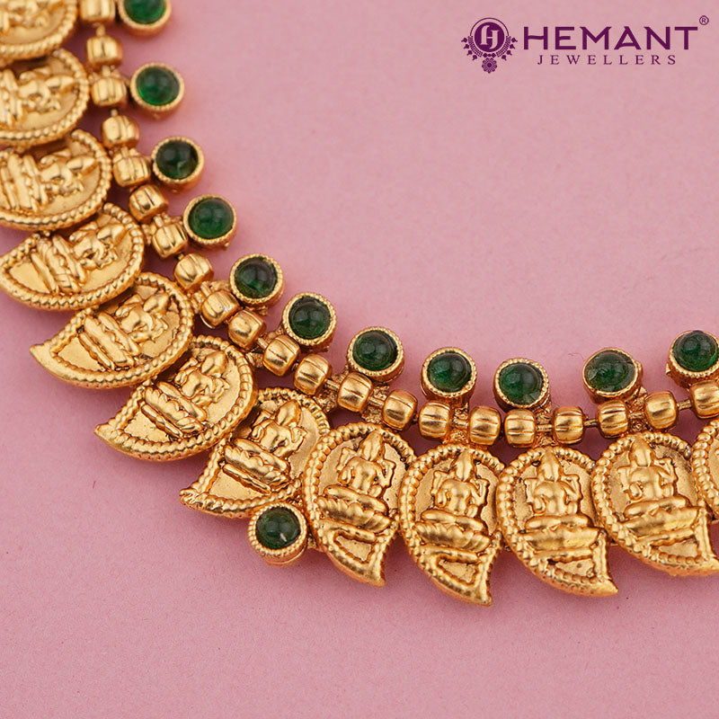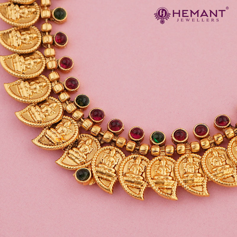 This set, paired with complementing earrings, exudes the splendor of South Indian temple jewelry, making it ideal for weddings, festive events, and cultural festivities. Crafted from top-quality gold-plated material, it guarantees a lavish look and lasting strength, all while remaining lightweight for effortless wear.
