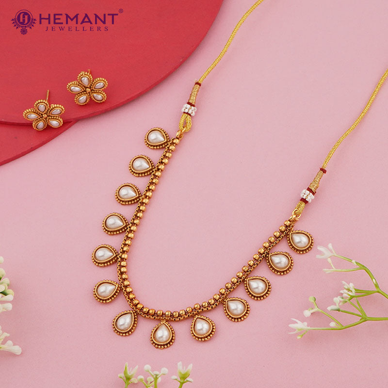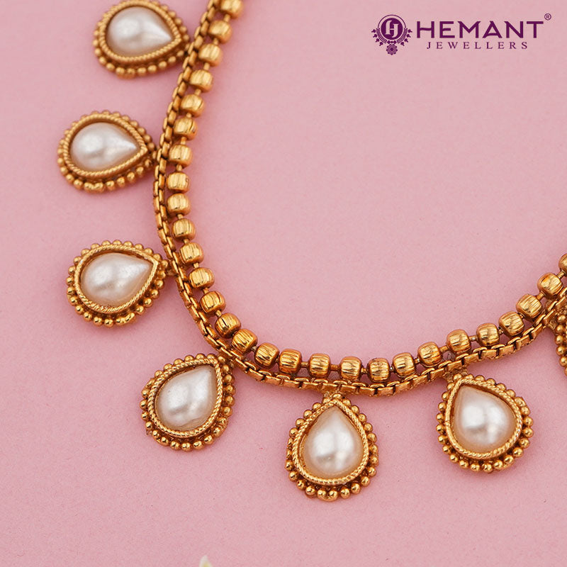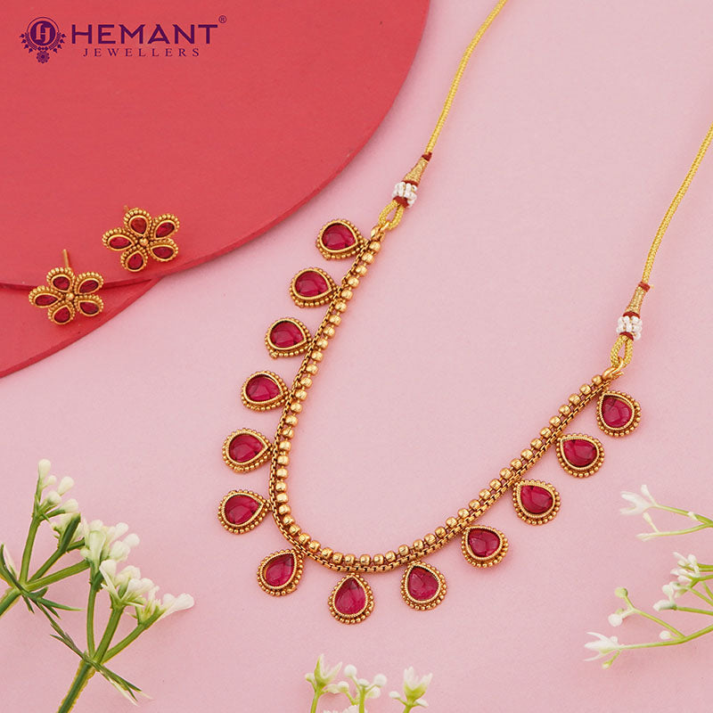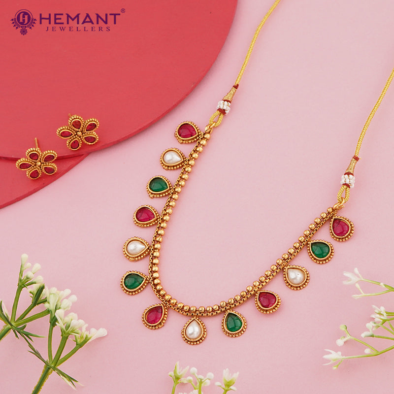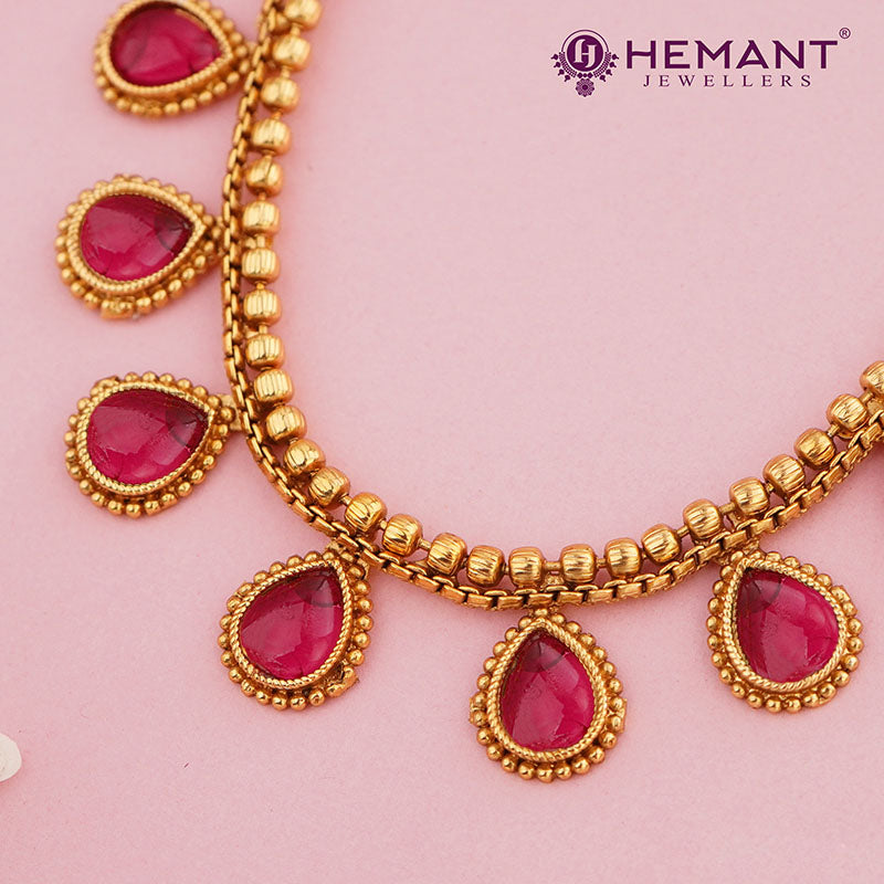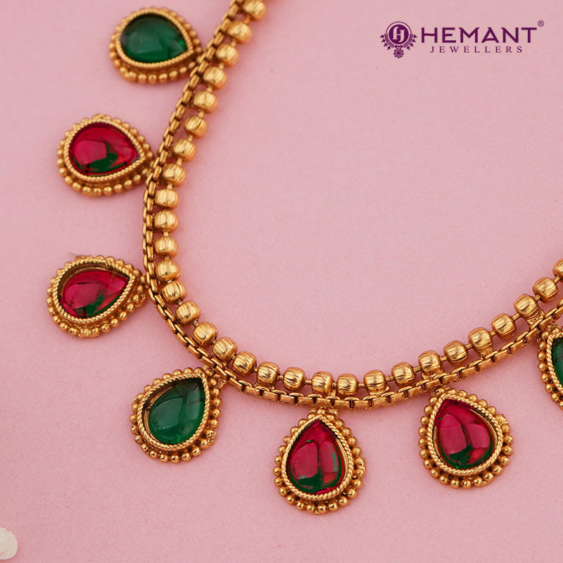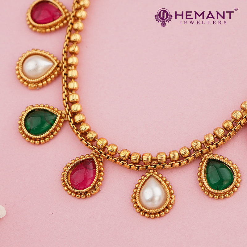 This set, paired with complementing earrings, exudes the splendor of South Indian temple jewelry, making it ideal for weddings, festive events, and cultural festivities. Crafted from top-quality gold-plated material, it guarantees a lavish look and lasting strength, all while remaining lightweight for effortless wear.