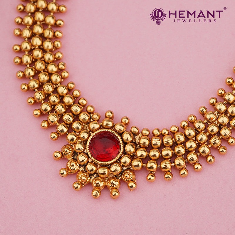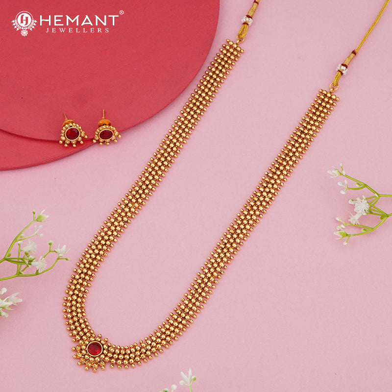 This set, paired with complementing earrings, exudes the splendor of South Indian temple jewelry, making it ideal for weddings, festive events, and cultural festivities. Crafted from top-quality gold-plated material, it guarantees a lavish look and lasting strength, all while remaining lightweight for effortless wear.