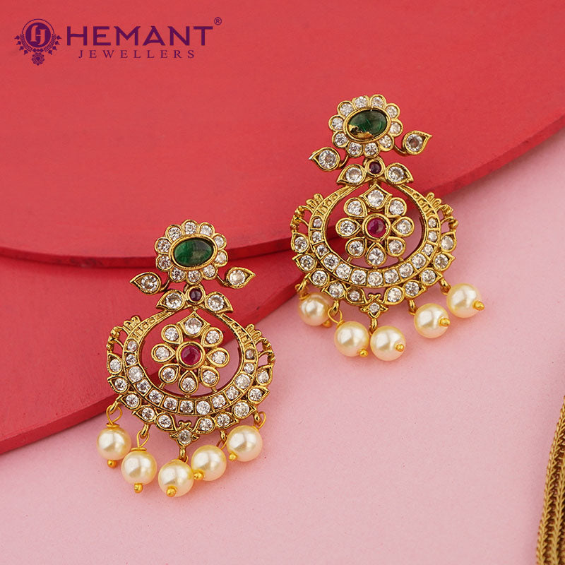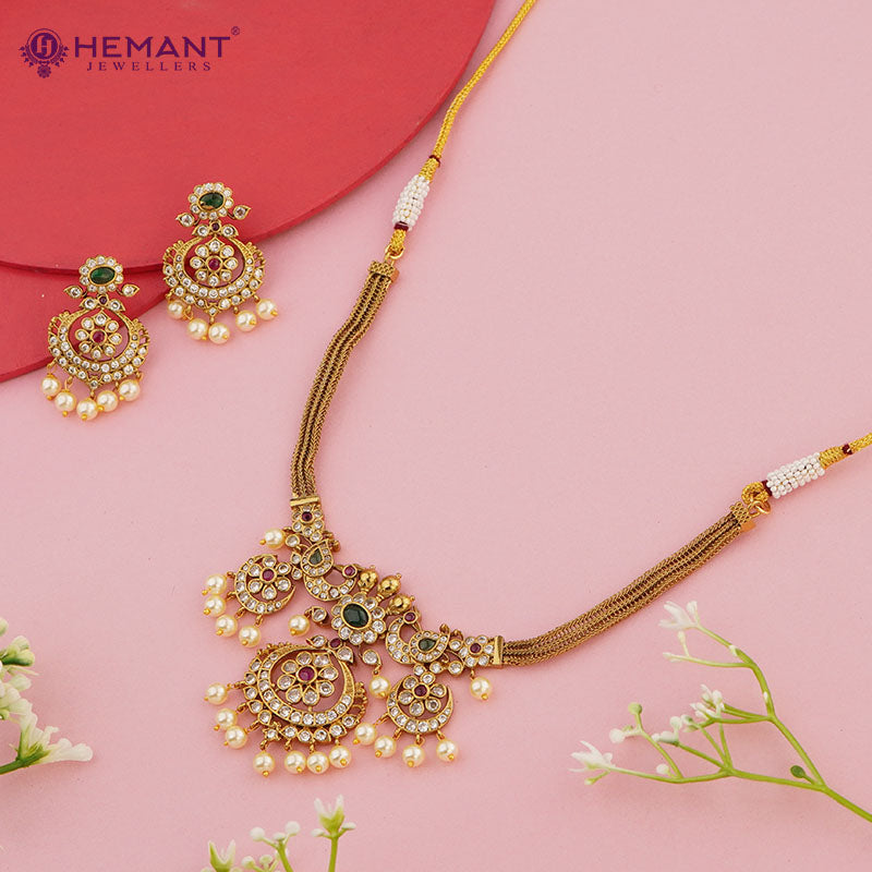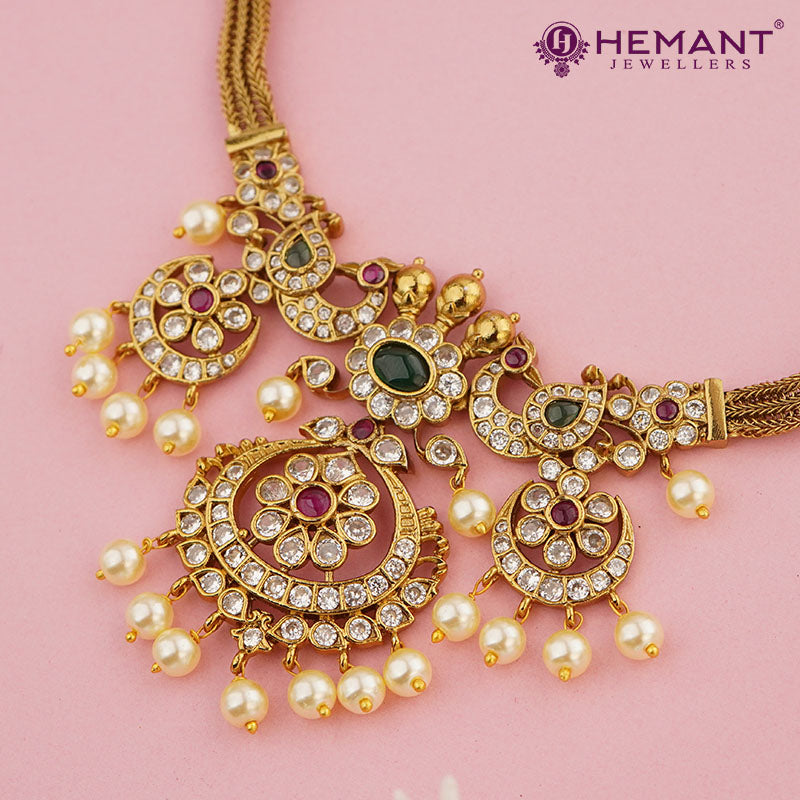 Unit price perThis set, paired with complementing earrings, exudes the splendor of South Indian temple jewelry, making it ideal for weddings, festive events, and cultural festivities. Crafted from top-quality gold-plated material, it guarantees a lavish look and lasting strength, all while remaining lightweight for effortless wear.