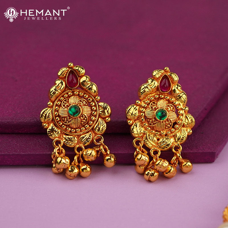 This set, paired with complementing earrings, exudes the splendor of South Indian temple jewelry, making it ideal for weddings, festive events, and cultural festivities. Crafted from top-quality gold-plated material, it guarantees a lavish look and lasting strength, all while remaining lightweight for effortless wear.