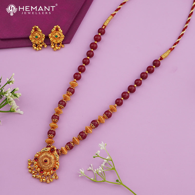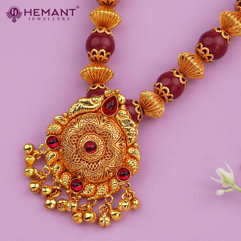 This set, paired with complementing earrings, exudes the splendor of South Indian temple jewelry, making it ideal for weddings, festive events, and cultural festivities. Crafted from top-quality gold-plated material, it guarantees a lavish look and lasting strength, all while remaining lightweight for effortless wear.