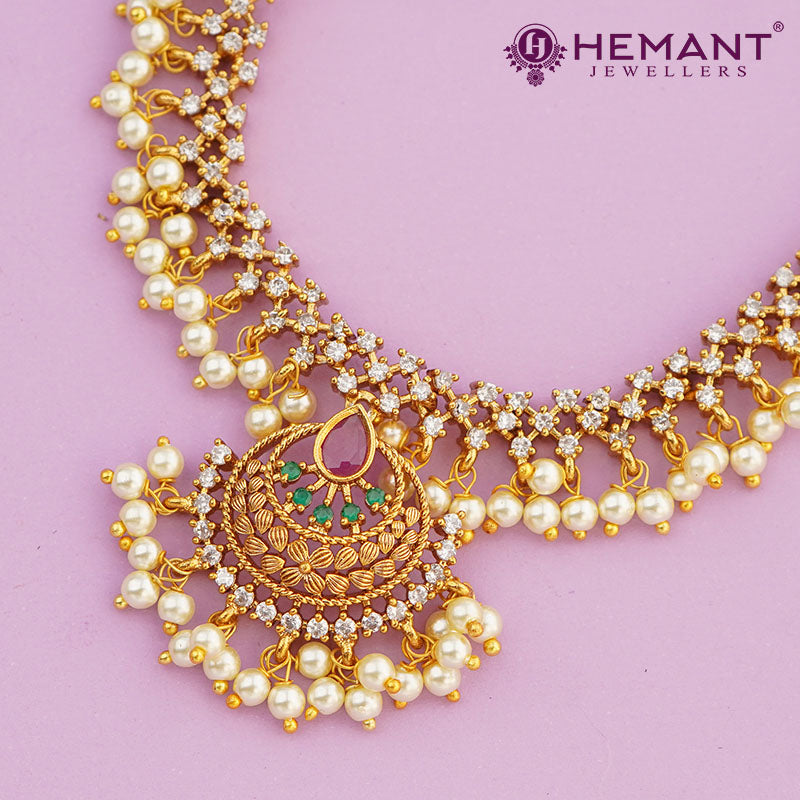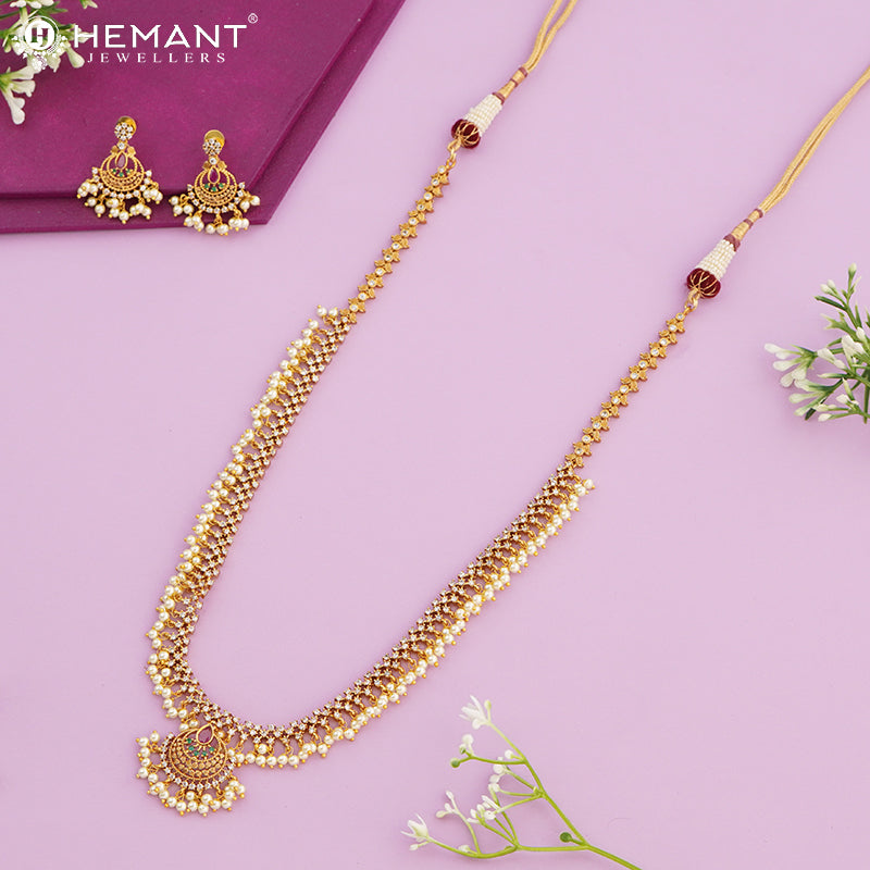 This set, paired with complementing earrings, exudes the splendor of South Indian temple jewelry, making it ideal for weddings, festive events, and cultural festivities. Crafted from top-quality gold-plated material, it guarantees a lavish look and lasting strength, all while remaining lightweight for effortless wear.