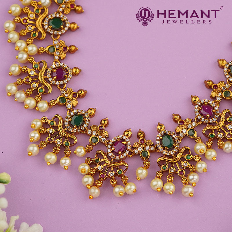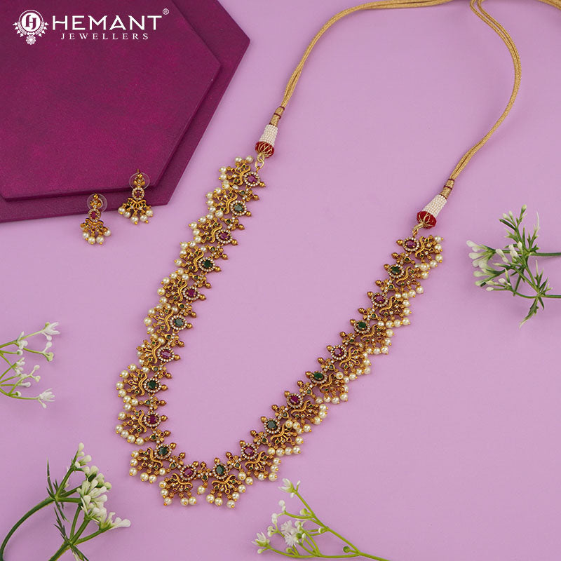 This set, paired with complementing earrings, exudes the splendor of South Indian temple jewelry, making it ideal for weddings, festive events, and cultural festivities. Crafted from top-quality gold-plated material, it guarantees a lavish look and lasting strength, all while remaining lightweight for effortless wear.