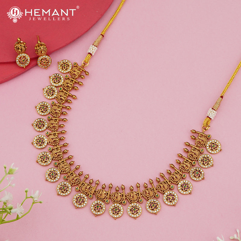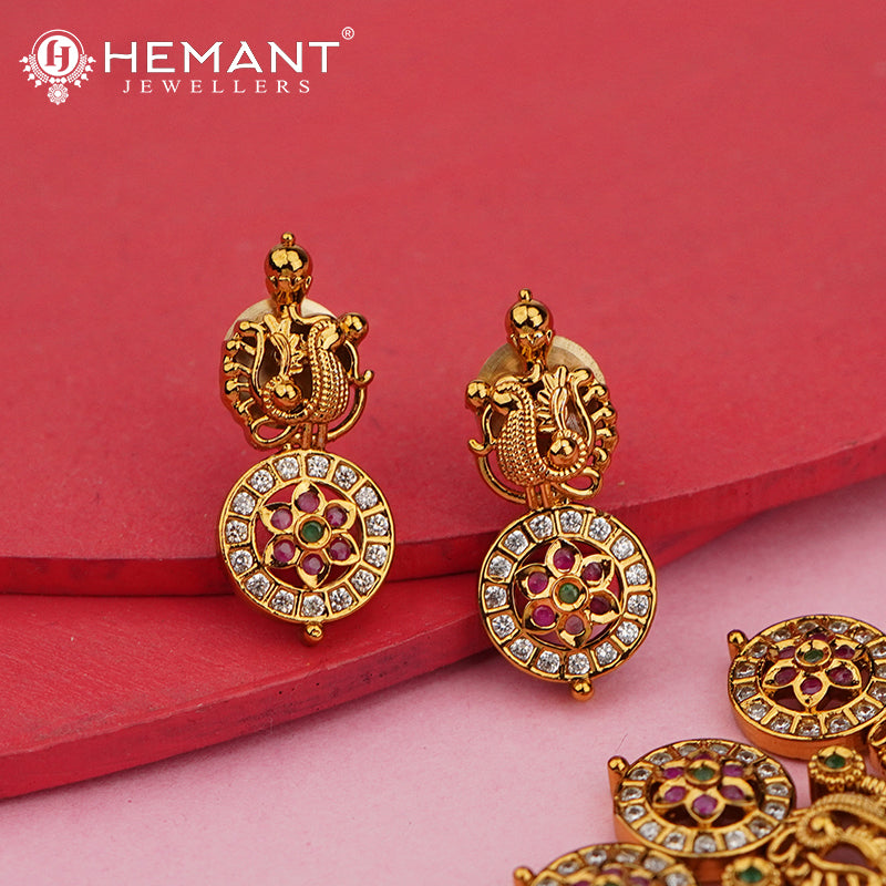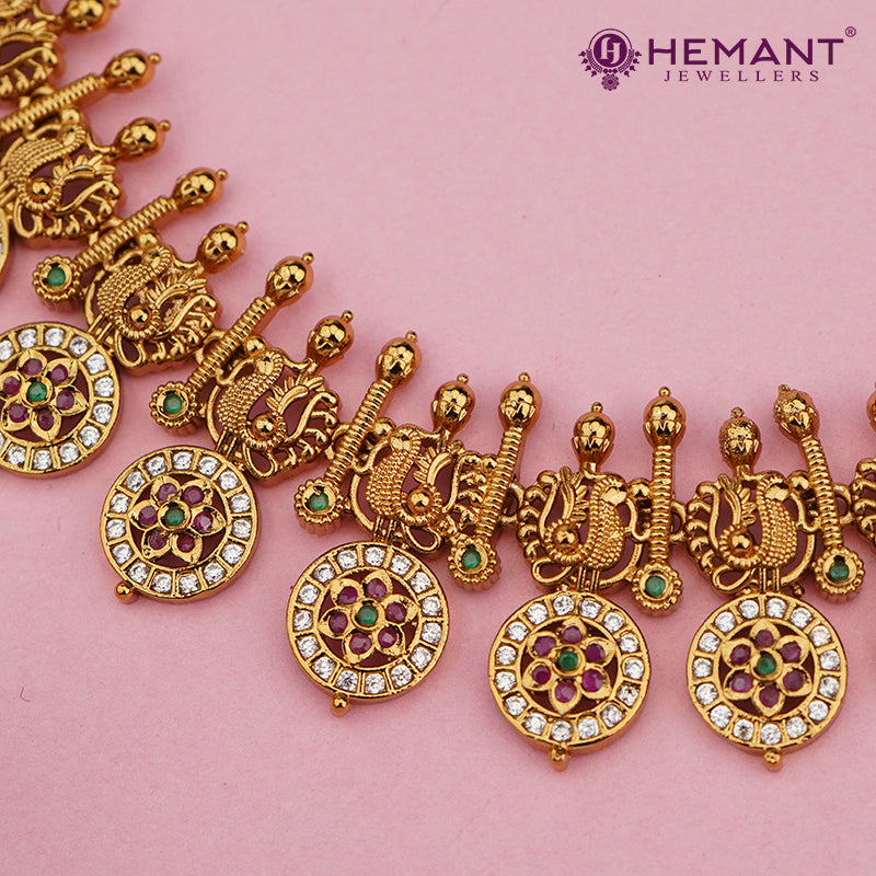 This antique-finish necklace set captures the regal elegance of South Indian temple artistry. The necklace features alternating peacock designs paired with stone-studded circular drops that enhance its traditional yet statement-worthy charm. The combination of ruby, green, and white stones adds festive vibrancy, while the structured symmetry gives the piece a royal, heritage feel. Matching earrings mirror the peacock and floral motif to complete the set.