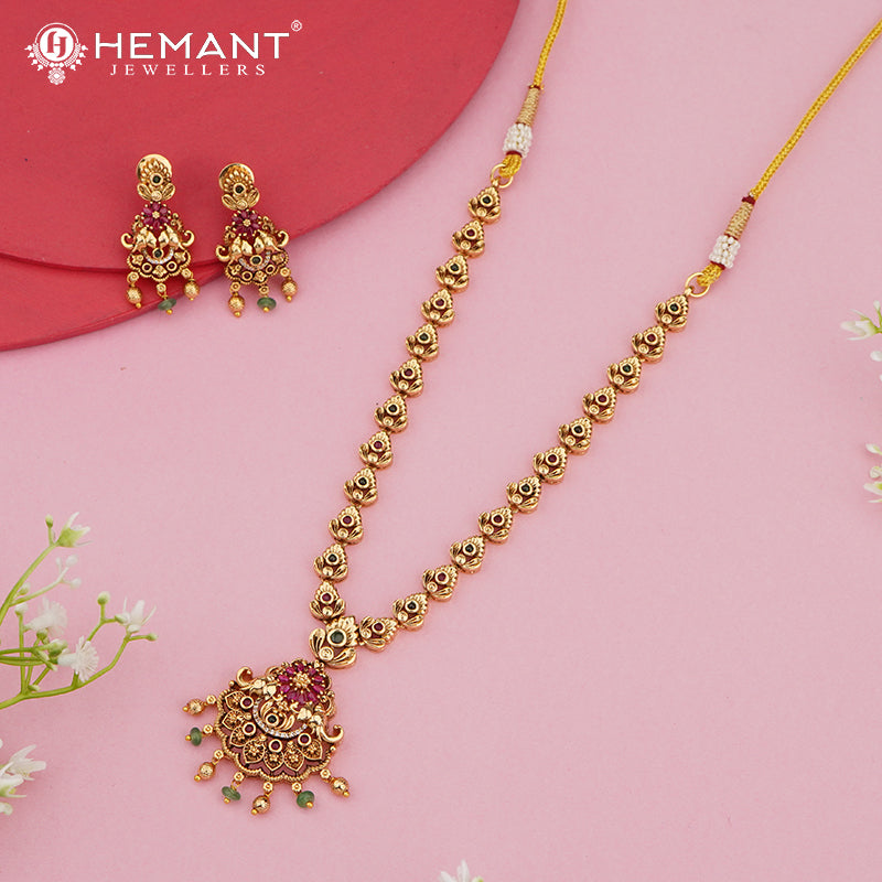 This design is perfect for occasions where you want to reflect rich heritage with a graceful statement. Paired with intricately crafted drop earrings, the set completes a regal look ideal for weddings, haldi-mehendi events, or festive pujas.