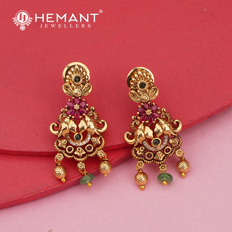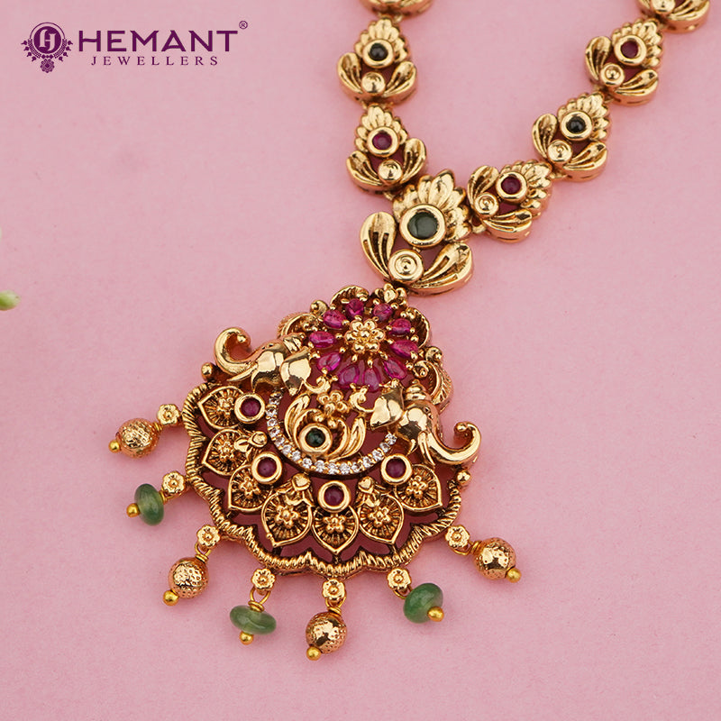 A timeless expression of Indian artistry, this antique-finish necklace set showcases detailed peacock motifs along the neckline, each adorned with alternating ruby-red and emerald-green stones. The centrepiece is a stunning multi-layered pendant featuring a bold floral arrangement, crescent elements, and delicately hanging green bead drops, enhancing its festive charm.