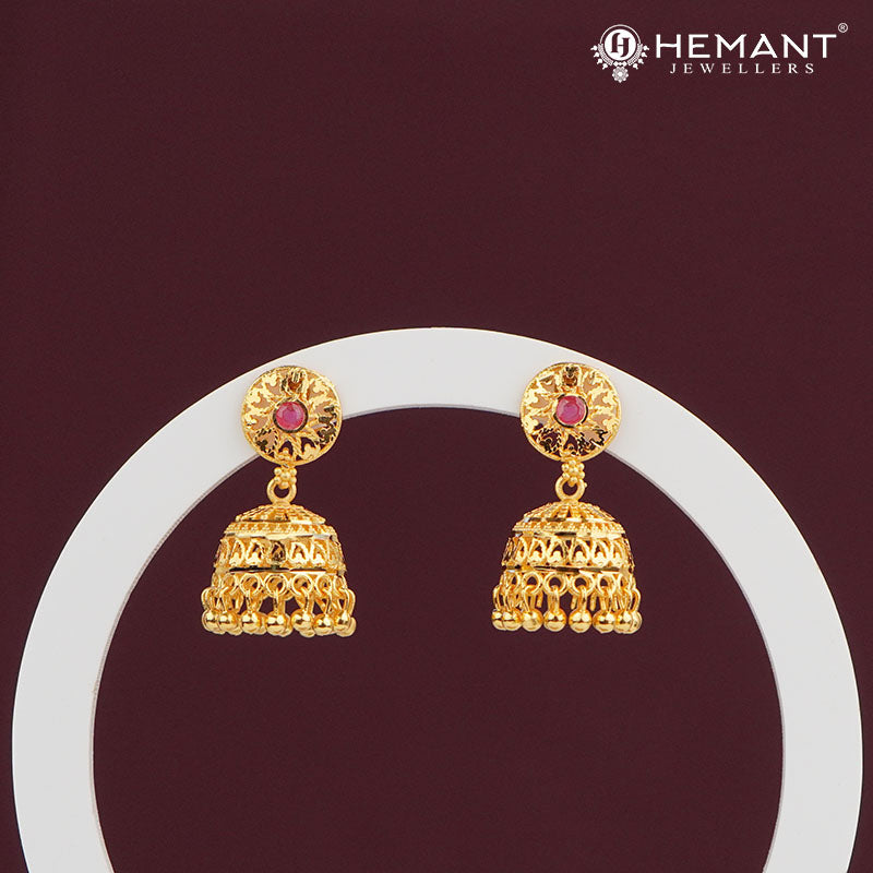 Adorn your ethnic look with these elegant Forming Gold Jhumka Earrings from Hemant Jewellers. Designed with a traditional dome-shaped jhumka and delicate hanging beads, the earrings are topped with a beautifully engraved floral stud featuring a red stone. Crafted in high-quality forming gold finish, these earrings exude festive charm while offering comfort and lightweight wear.