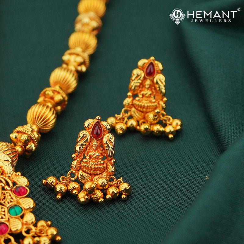 Step into divine elegance with this traditional temple necklace set featuring a majestic pendant of Goddess Lakshmi surrounded by intricate motifs and vibrant red-green stones. The design is further elevated with finely carved spherical beads and matching earrings, creating a rich, heritage look. Ideal for festive occasions, weddings, or religious ceremonies, this set exudes timeless South Indian charm.