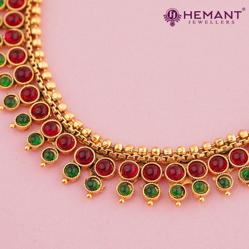 This set, paired with complementing earrings, exudes the splendor of South Indian temple jewelry, making it ideal for weddings, festive events, and cultural festivities. Crafted from top-quality gold-plated material, it guarantees a lavish look and lasting strength, all while remaining lightweight for effortless wear.