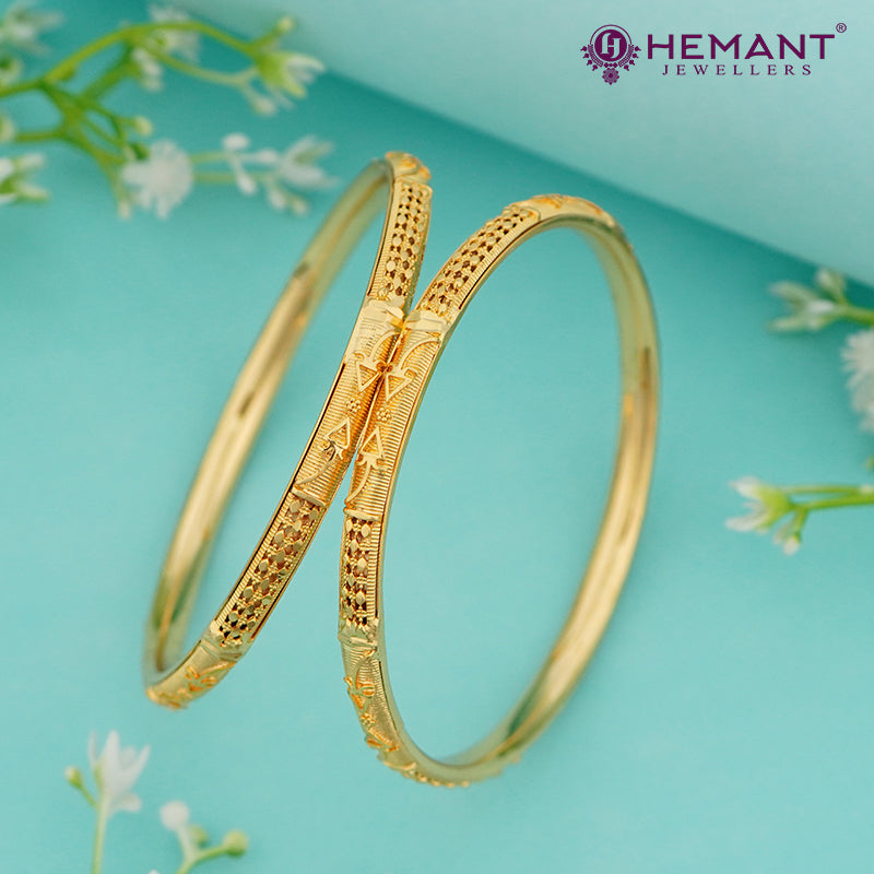 These classic gold-finish bangles from Hemant Jewellers bring timeless tradition to your wrist. The design features a symmetrical diamond-cut pattern running along the length, complemented by elegant lotus-style floral engravings at the center. The lightweight build and traditional finish make this pair ideal for special cultural occasions.