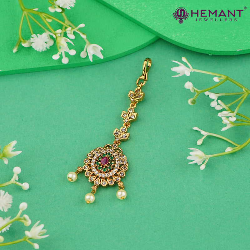 Adorn your forehead with this Antique Tikka, a symbol of grace and beauty. Crafted from a durable copper alloy, it's embellished with synthetic stones and beads. The design exudes a vintage charm, making it a perfect accessory for traditional events. Whether attending a wedding or a festive celebration, this Tikka will enhance your ethnic look with its timeless elegance.