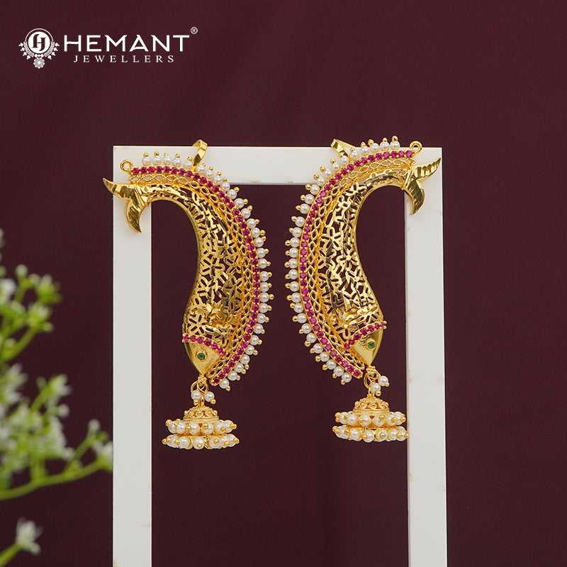 This stunning peacock earcuff (कान) is a perfect blend of artistry and elegance. Featuring a pair of intricately crafted peacocks, the design is embellished with ruby-red teardrop stones, shimmering white CZ crystals, and delicate green stone eyes for a realistic touch.