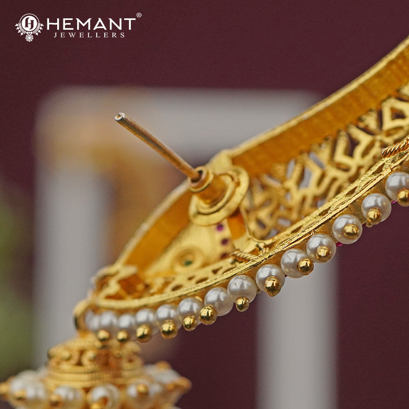 The curved body gracefully follows the contour of the ear, giving a statement look while ensuring comfort. At the bottom, a traditional pearl cluster jhumka adds movement and festive charm, making it ideal for pairing with ethnic attire.