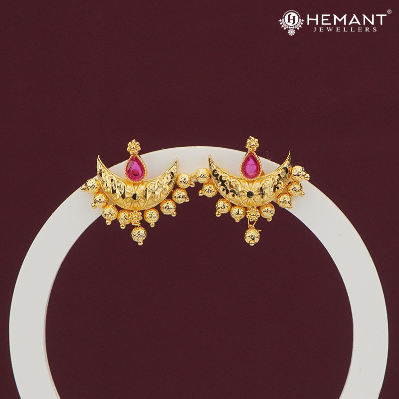 Unit price perChannel celestial elegance with these half-moon shaped earrings adorned with intricate detailing and a ruby-colored tear-drop stone. The antique-style gold polish and ghungroo danglers enhance their traditional charm, making them ideal for sarees and festive ensembles.