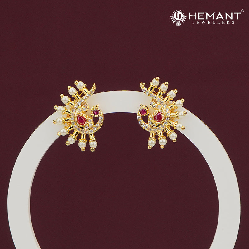 Unit price perGracefully crafted in a peacock-inspired silhouette, these micro gold-plated earrings are studded with shimmering CZ stones, red ruby-style accents, and delicate pearl hangings. A beautiful blend of culture and charm, perfect for festive wear or ethnic occasions.