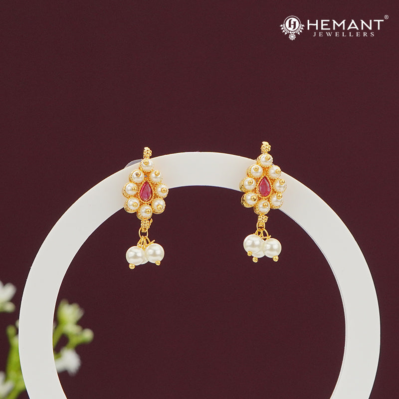 Traditional Pearl Drop Earrings with Red Stone Center – 3319