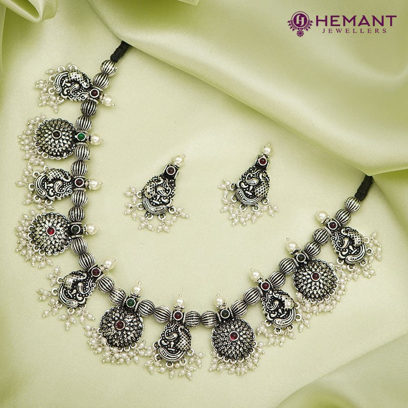 Traditional Oxidized Guttapusalu Haar Peacock Silver WT