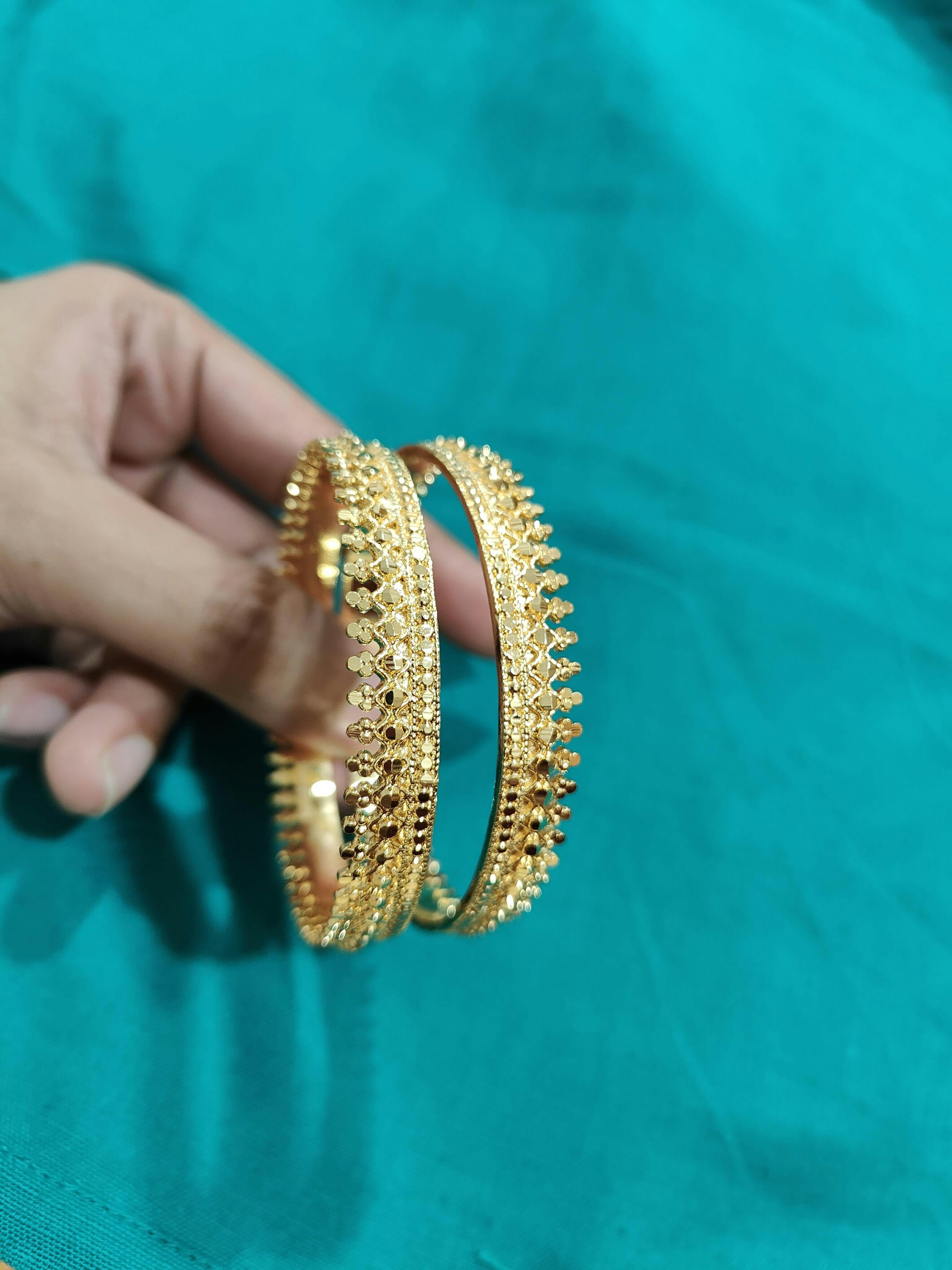 Unit price perCrafted with intricate detail and finished in a rich gold tone, these forming Pichudi bangles bring a graceful elegance to your festive looks. With their finely dotted edges and traditional lattice design, they perfectly complement sarees, salwar suits, and more.