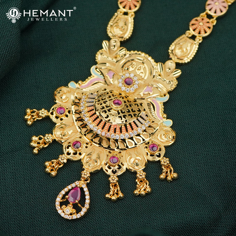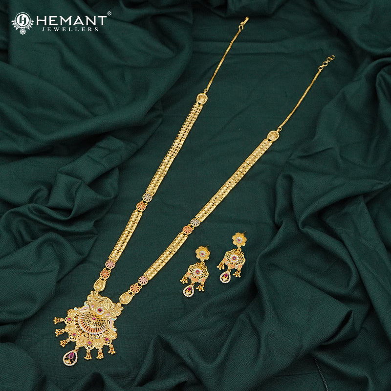 The long-forming necklace is paired with complementary earrings, completing the ensemble with a regal touch. Ideal for bridal wear, festive occasions, and cultural events, this Rajwadi necklace enhances sarees, lehengas, and traditional Maharashtrian or South-Indian attire.