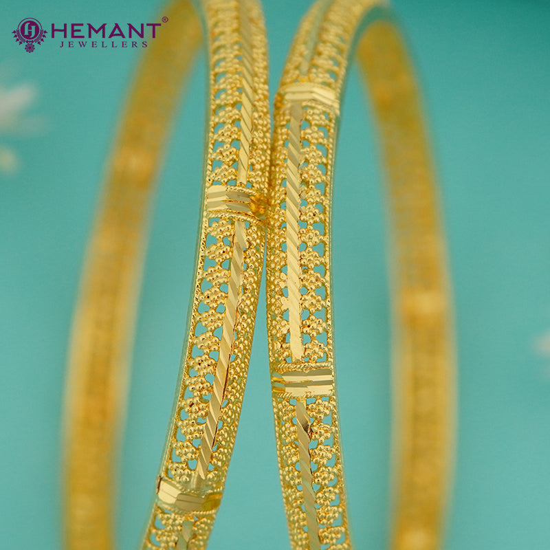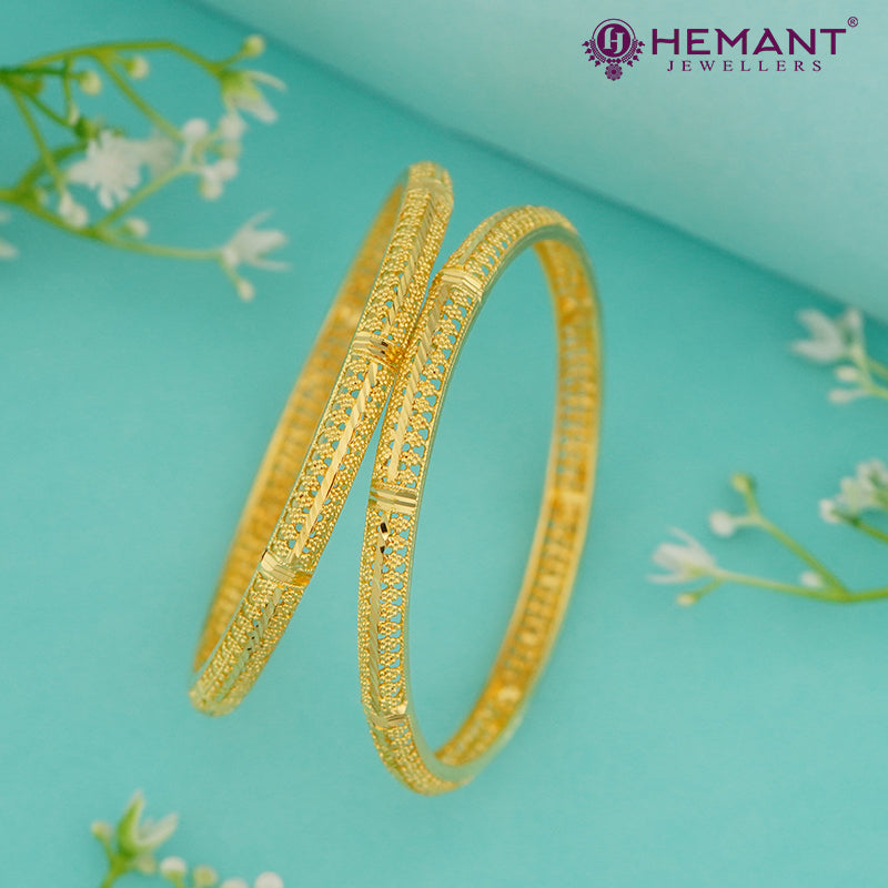 Unit price perMake a bold yet traditional statement with this pair of forming gold kada bangles from Hemant Jewellers. The bangles feature a richly textured surface dotted with tiny embossed beads, accentuated by diamond-cut motifs that reflect light beautifully without a glossy finish. Designed for daily wear as well as festive pairings, these bangles offer a timeless charm with their minimal yet striking details.