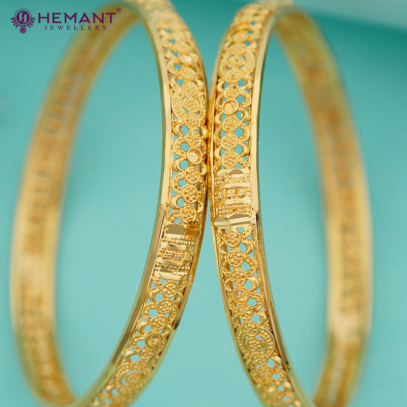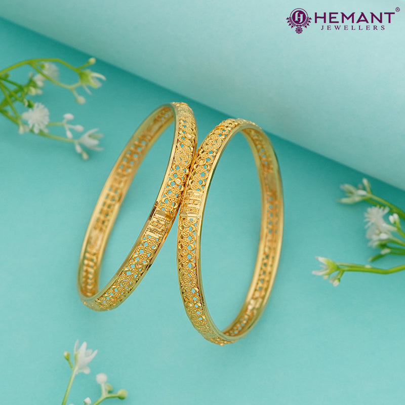 Unit price perThese beautifully designed gold-finish bangles from Hemant Jewellers are a timeless accessory for any traditional outfit. Crafted with delicate jali-style cutwork and detailed floral patterns, the design reflects fine craftsmanship and cultural elegance. The second image captures the close-up intricacy of the carving, making them an ideal pick for women who appreciate subtle, traditional charm.