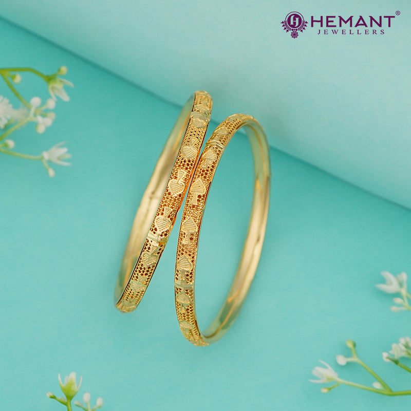 Unit price perMake a bold yet traditional statement with this pair of forming gold kada bangles from Hemant Jewellers. The bangles feature a richly textured surface dotted with tiny embossed beads, accentuated by diamond-cut motifs that reflect light beautifully without a glossy finish. Designed for daily wear as well as festive pairings, these bangles offer a timeless charm with their minimal yet striking details.