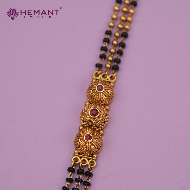 Unit price perA striking mangalsutra with triple-chain black beads, antique golden beads, and dual round pendants adorned with ruby stone detailing.