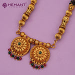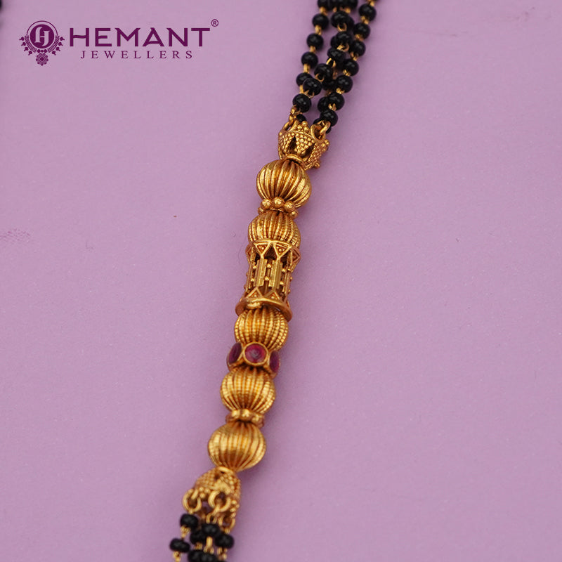 Unit price perA striking mangalsutra with triple-chain black beads, antique golden beads, and dual round pendants adorned with ruby stone detailing.