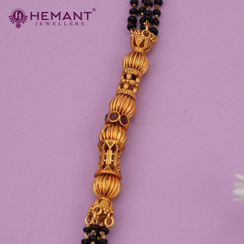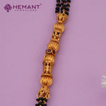 Unit price perA striking mangalsutra with triple-chain black beads, antique golden beads, and dual round pendants adorned with ruby stone detailing.
