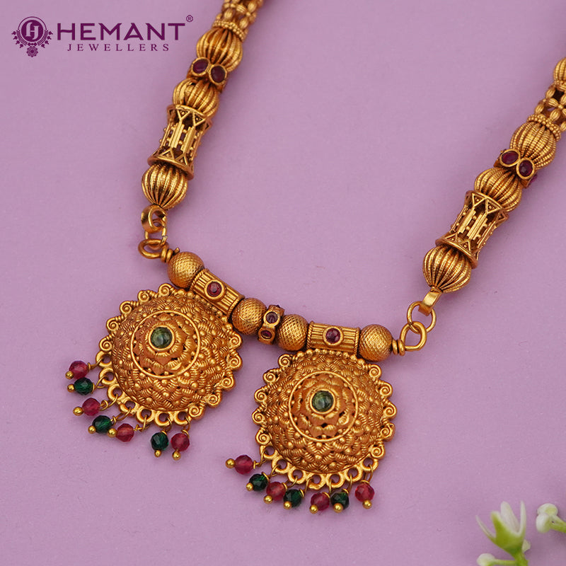 At its heart lies a dual circular pendant set, designed with intricate carvings, floral-inspired motifs, and ruby stone embellishments. The hanging golden ghungroo-style droplets add graceful movement, making this piece a standout for festive and bridal occasions.