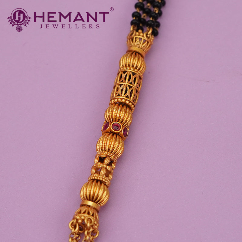 A striking mangalsutra with triple-chain black beads, antique golden beads, and dual round pendants adorned with ruby stone detailing.