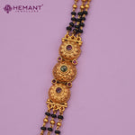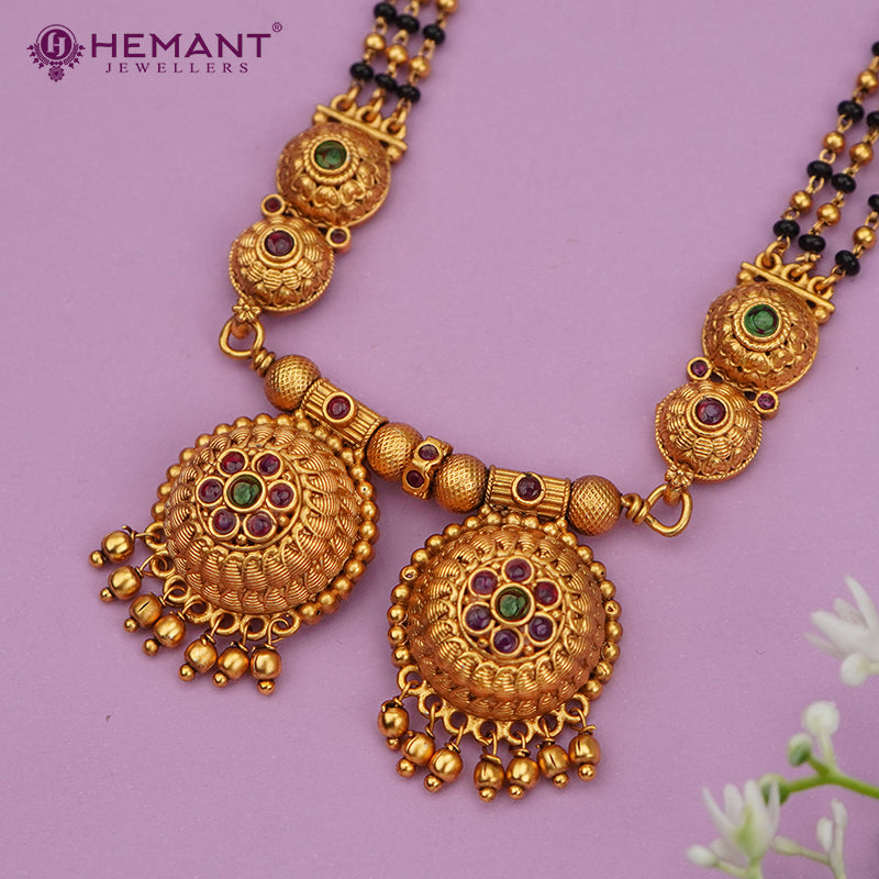 Unit price perA striking mangalsutra with triple-chain black beads, antique golden beads, and dual round pendants adorned with ruby stone detailing.