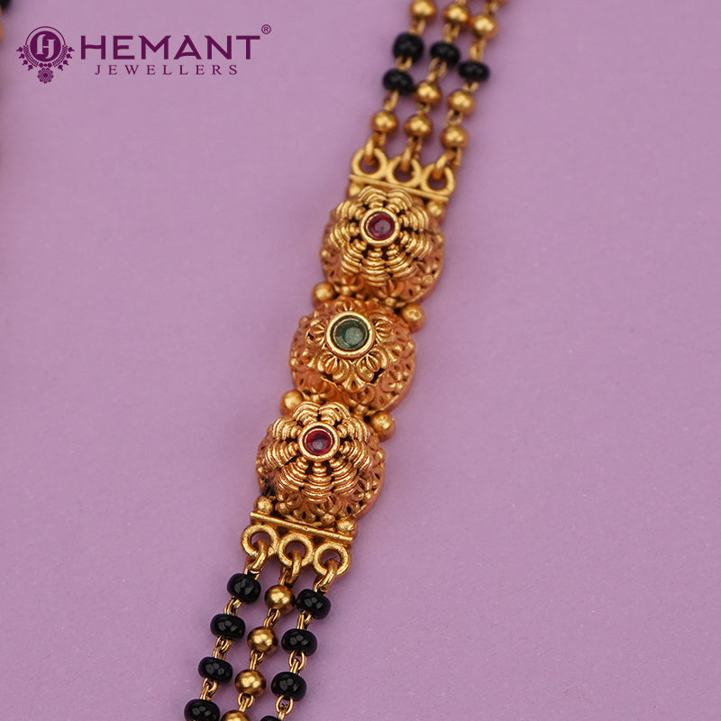 This exquisite mangalsutra blends traditional craftsmanship with timeless beauty. The triple-strand black beads are elegantly interspaced with antique-finished golden bead segments, each enhanced with ruby-colored stones for a royal touch.