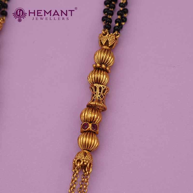 This exquisite mangalsutra blends traditional craftsmanship with timeless beauty. The triple-strand black beads are elegantly interspaced with antique-finished golden bead segments, each enhanced with ruby-colored stones for a royal touch.