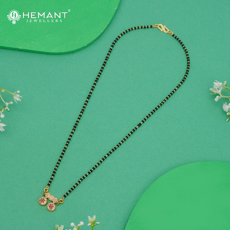 This mangalsutra is a striking blend of modern style and timeless symbolism, featuring a dual coin-inspired pendant adorned with ruby red stones, green accents, and shimmering CZ embellishments. The central alignment of motifs with floral-inspired settings adds elegance, while the sparkling detailing gives it a festive richness.