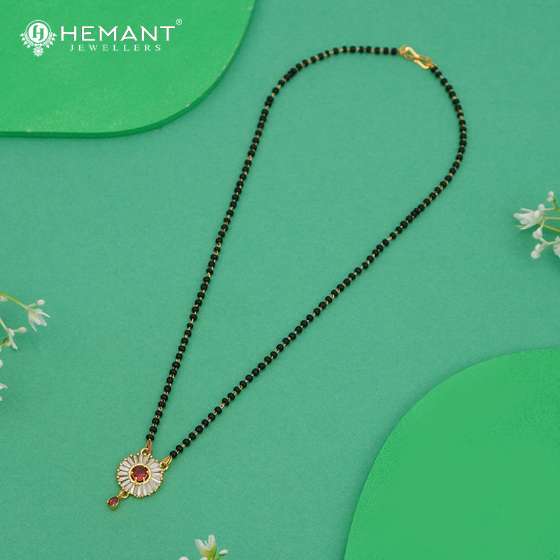 This mangalsutra blends elegance and tradition in a refined style. Featuring two-tone black and gold bead segments along the chain, it adds a distinct touch of richness and detail. The highlight is its artistic pendant, designed with cutwork patterns, delicate curves, and stone-studded accents that add a soft sparkle. A tiny hanging droplet completes the pendant, enhancing its charm and flow.