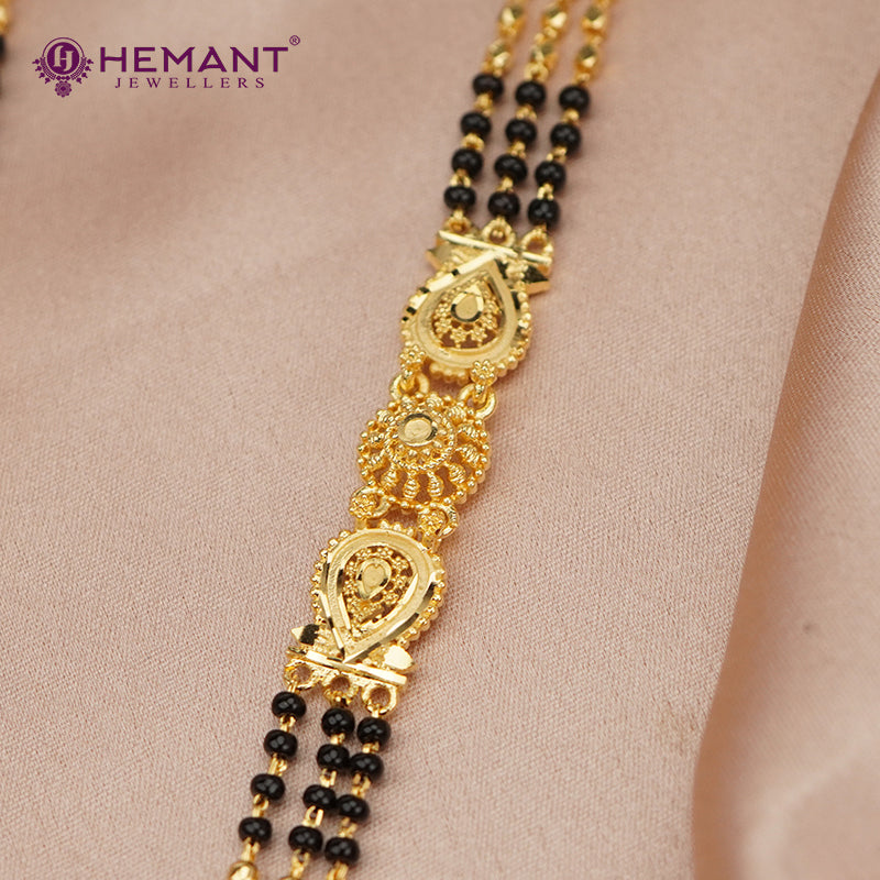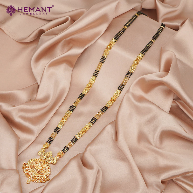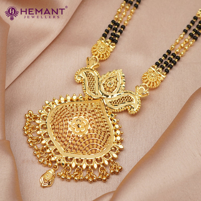 This beautifully crafted Maharashtrian mangalsutra by Hemant Jewellers exudes elegance with its distinctive floral and peacock pendant. The pendant is intricately designed, combining traditional artistry with fine detailing, while the classic black beads and gold chain balance modern appeal with cultural significance. Perfect for special occasions, this mangalsutra is a symbol of love and commitment, making it a cherished addition to any jewelry collection. Embrace the beauty of tradition with this timeless piece.