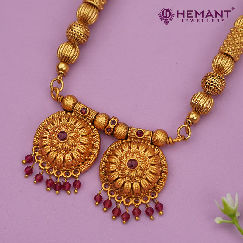 At its heart lies a dual circular pendant set, designed with intricate carvings, floral-inspired motifs, and ruby stone embellishments. The hanging golden ghungroo-style droplets add graceful movement, making this piece a standout for festive and bridal occasions.