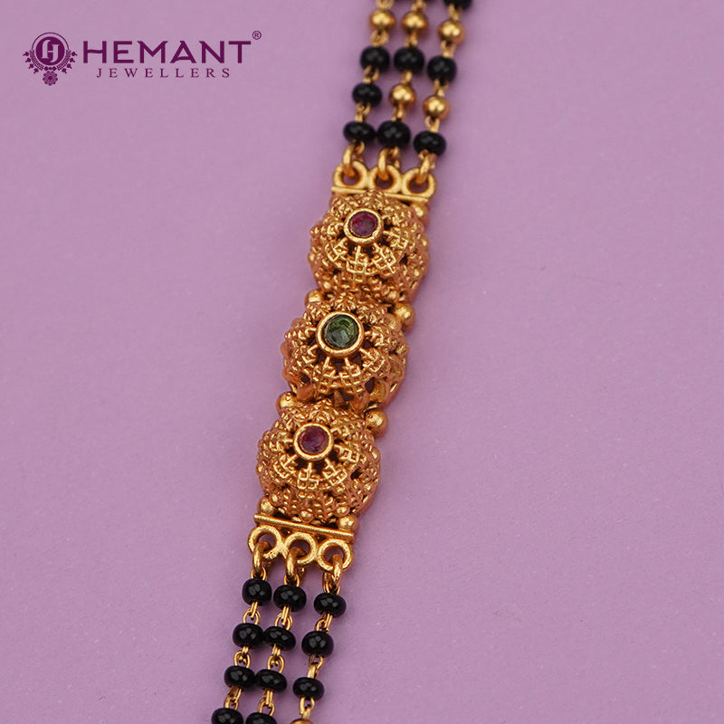 This exquisite mangalsutra blends traditional craftsmanship with timeless beauty. The triple-strand black beads are elegantly interspaced with antique-finished golden bead segments, each enhanced with ruby-colored stones for a royal touch.