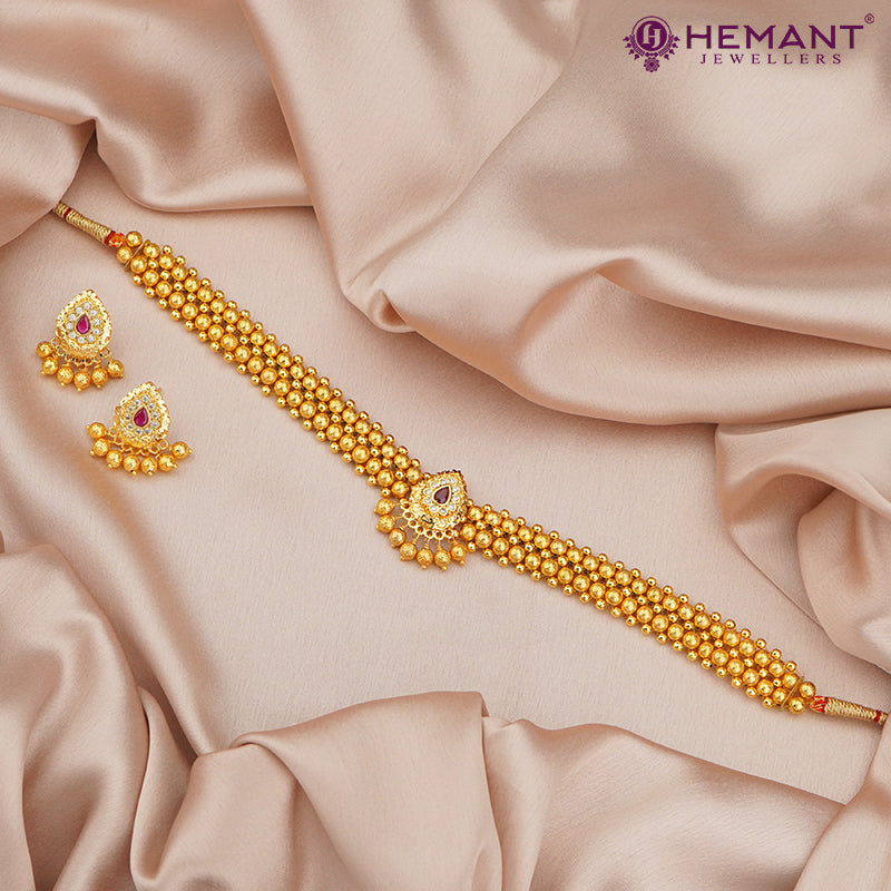 Traditional Maharashtrian Kolhapuri Thushi Patta Golden Karwari Pan RG With Earrings
