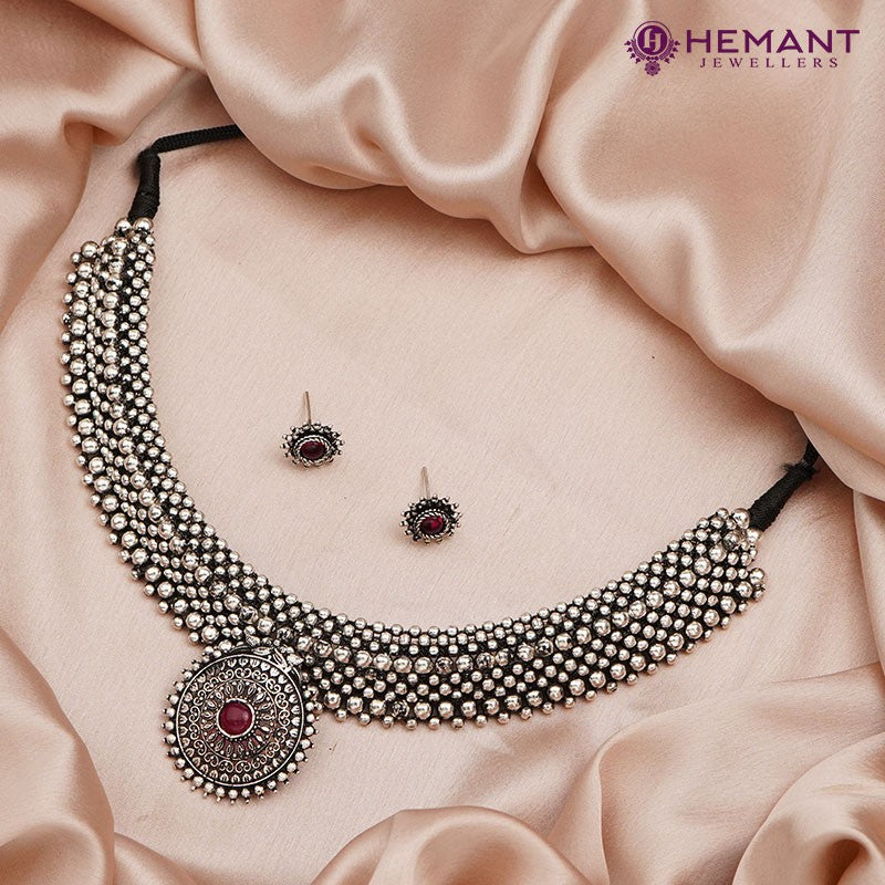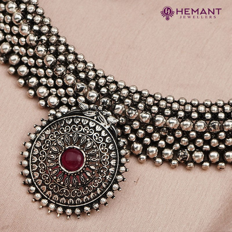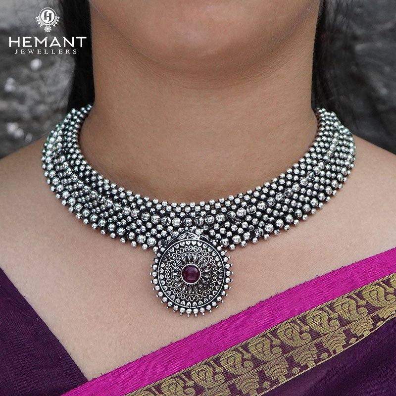Traditional Maharashtrian Kolhapuri Double Thushi Rava Peacock Silver (Oxidized) WT