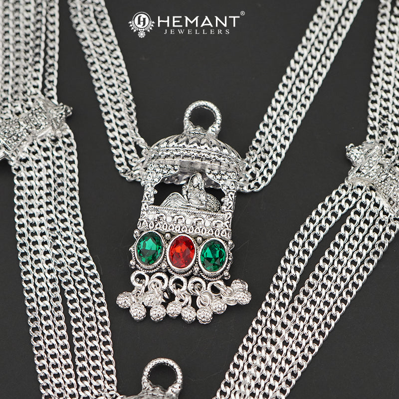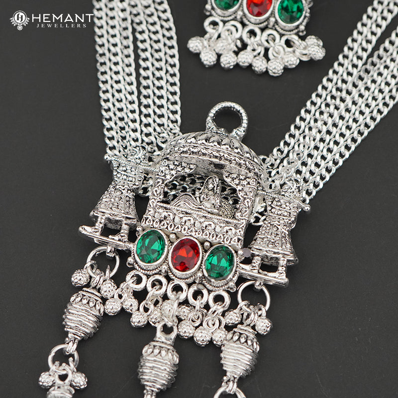 Composed of layered silver-tone chains, this piece features red and green stones and detailed jhumka-style danglers. The oxidized finish enhances its temple-style grandeur.